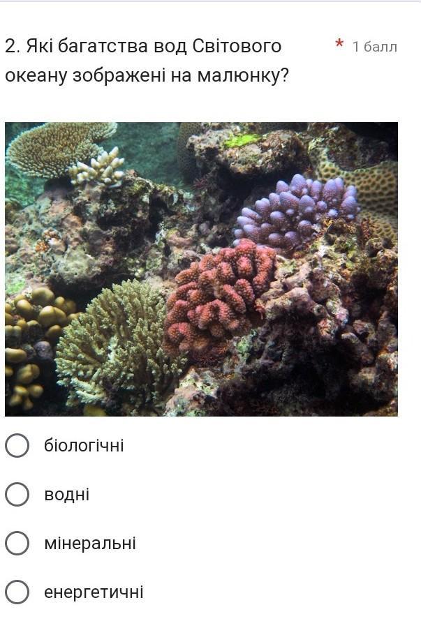 2. Які багатства вод Світового океану зображені на малюнку? о біологічні о водні о мінеральні о енергетичні * 1 балл