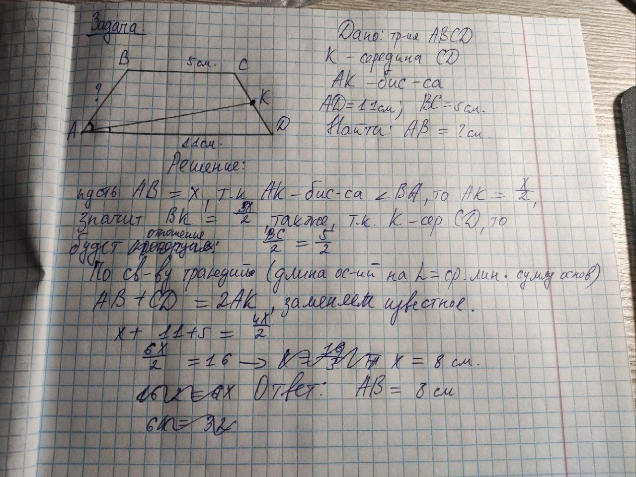 В трапеции ABCD точка К - середина боковой стороны CD, а АК - биссектриса угла ВА. Найдите длину стороны АВ, если AD = 11, BC = 5. Если можно, с чертежом