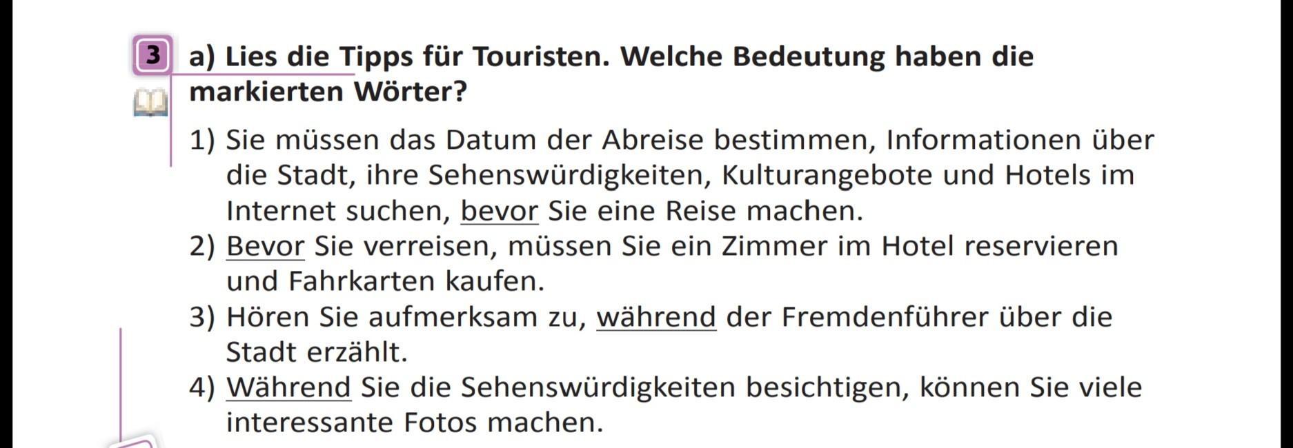 1) Sie müssen das Datum der Abreise bestimmen, Informationen über die Stadt, ihre Sehenswürdigkeiten, Kulturangebote und Hotels im Internet suchen, bevor Sie eine Reise machen. 2) Bevor Sie verreisen, müssen Sie ein Zimmer im Hotel reservieren und Fahrkarten kaufen. 3) Hören Sie aufmerksam zu, während der Fremdenführer über die Stadt erzählt. 4) Während Sie die Sehenswürdigkeiten besichtigen, können Sie viele interessante Fotos machen.