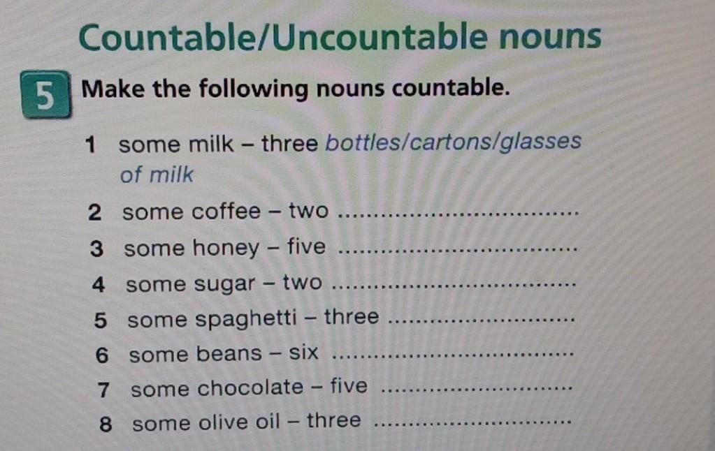 Countable/Uncountable nouns 5 Make the following nouns countable. 1 some milk - three bottles/cartons/glasses of milk 2 some coffee - two .............. some honey - five some sugar - two ... some spaghetti - three... 3 4 5 6 some beans - six 7 some chocolate - five ..... 8 some olive oil - three Quant ***