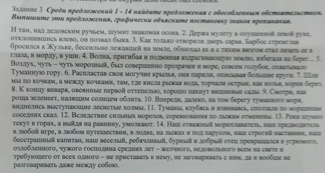срочно, дам 50 баллов. Задание 3 Среди предложений 1 - 14 найдите предложения с обособленным обстоятельством. Выпишите эти предложения, графически объясните постановку знаков препинания. И там, над дедовским ручьем, шумит знакомая осока. 2. Держа мулету в опущенной левой руке, отклонившись влево, он позвал быка. 3. Как только отворили дверь сарая, Барбос стремглав бросился к Жульке, бессильно лежавшей на земле, обнюхал ее и с тихим визгом стал лизать ее в глаза, в морду, в уши. 4. Волна, пригибая и подминая вздрагивающую землю, взбегала на берег... 5. Воздух, чуть-чуть морозный, был совершенно прозрачен и море, совсем голубое, охватывало Туманную гору. 6. Распластав свои могучие крылья, они парили, описывая большие круги. 7. Шли мы по кочкам, а между кочками, там, где кисла рыжая вода, торчали острые, как колья, корни берез. 8. К концу января, овеянные первой оттепелью, хорошо пахнут вишневые сады. 9. Смотри, как роща зеленеет, палящим солнцем облита. 10. Впереди, далеко, на том берегу туманного моря. виднелись выступающие лесистые холмы. 11. Туманы, клубясь и извиваясь, сползали по морщинам соседних скал. 12. Вследствие сильных морозов, соревнования по льгжам отменены. 13. Реки шумно текут в горах, а выйдя на равнину, умолкают. 14. Наш отважный мореплаватель, наш предводитель в любой игре, в любом путешествии, в лодке, на лыжах и под парусом, наш строгий наставник, наш бесстрашный капитан, наш веселый, ребячливый, бурный и добрый отец превращался в угрюмого, озлобленного, чужого господина средних лет - желчного, недовольного всем на свете и требующего от всех одного не приставать к нему, не заговаривать с ним, да и вообще не разговаривать даже между собою.