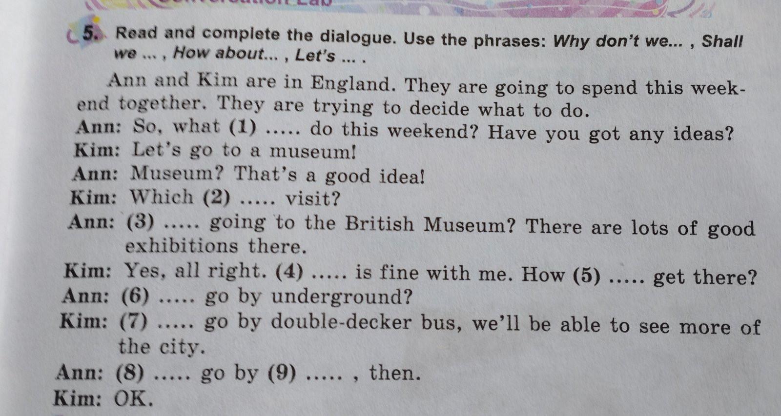5. Read and complete the dialogue. Use the phrases: Why don't we..., Shall we..., How about..., Let's .... Ann and Kim are in England. They are going to spend this week- end together. They are trying to decide what to do. Ann: So, what (1) ..... do this weekend? Have you got any ideas? Kim: Let's go to a museum! Ann: Museum? That's a good idea! Kim: Which (2)... visit? Ann: (3) ..... going to the British Museum? There are lots of good exhibitions there. *****. Kim: Yes, all right. (4) ..... is fine with me. How (5) ..... get there? Ann: (6) ..... go by underground? Kim: (7) ..... go by double-decker bus, we'll be able to see more of the city. Ann: (8) ..... go by (9) ....., then. Kim: OK.