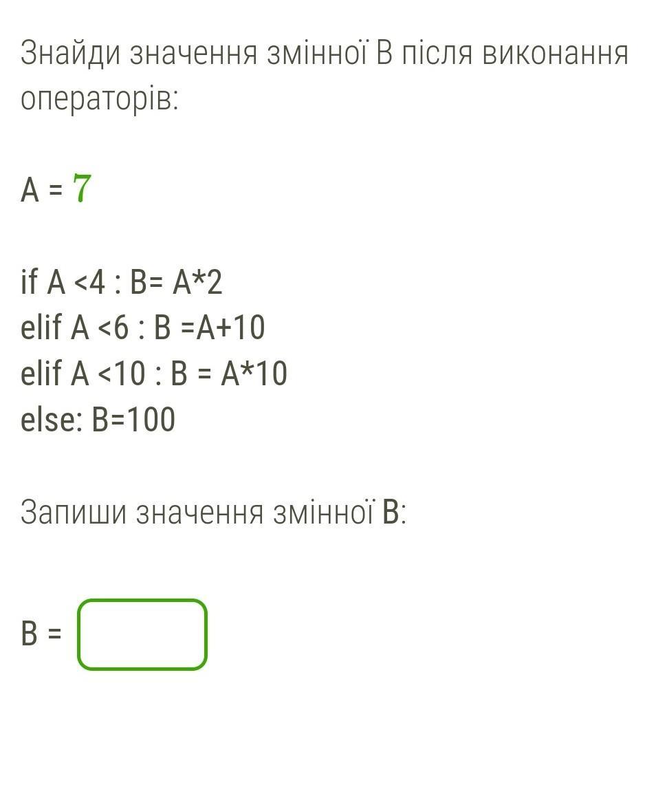 A = 7, тоді виконується умова, що A < 10. При цій умові B = A*10=7*10=70