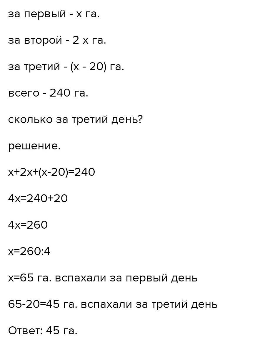 За три дні зорали 240 га поля. За другий день зорали у 2 рази менше, ніж за перший і на 20 га менше, ніж за третій. Скільки гектарів зорали за кожен день? У відповідь записати лише числа, у порядку зростання, через кому, без пробілів. Наприклад: 12,14,16 3