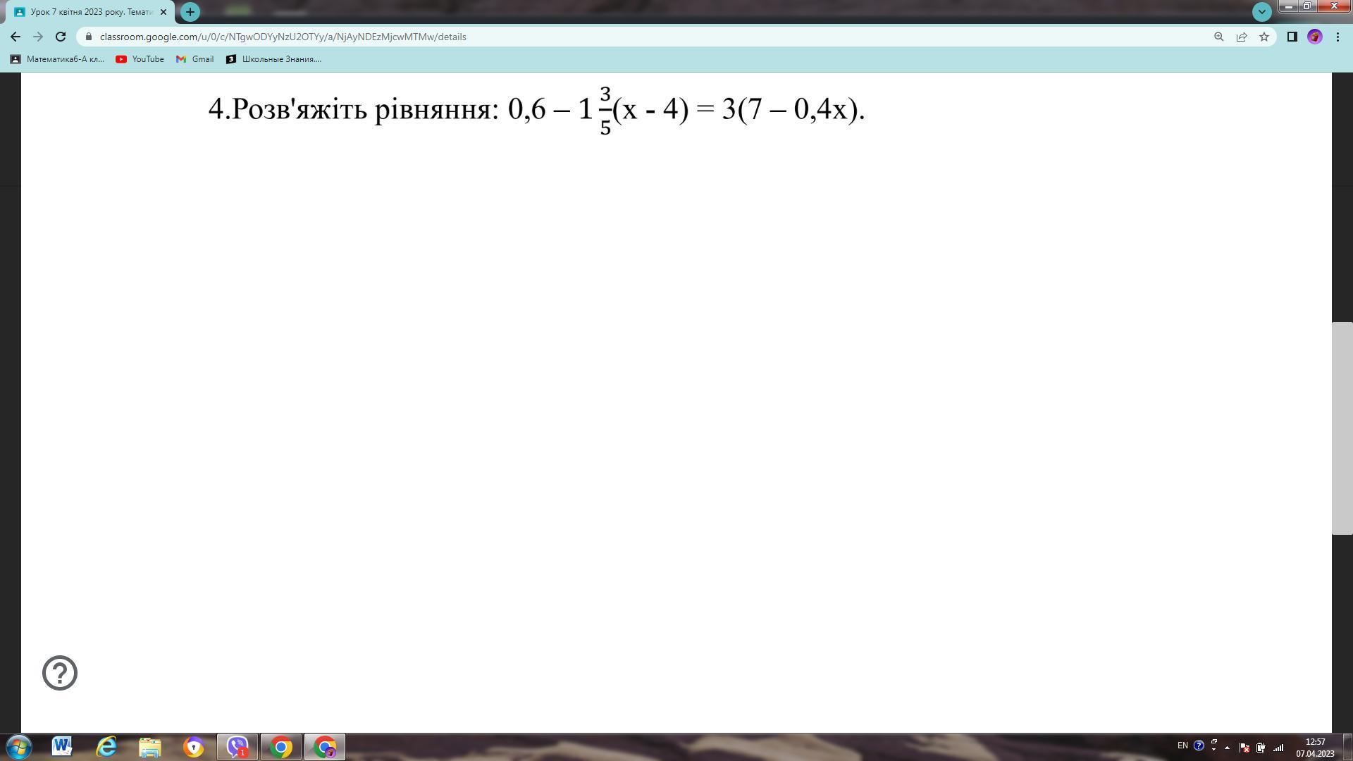 0,6-1 3/5(x-4) = 3(7-0.4x);
