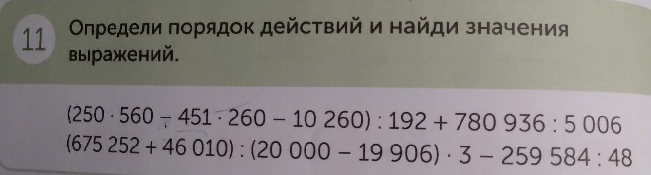 11 Определи порядок действий и найди значения выражений. (250-560-451-260-10 260): 192 + 780 936:5 006 (675 252 +46 010): (20 000 -19 906) 3-259 584:48