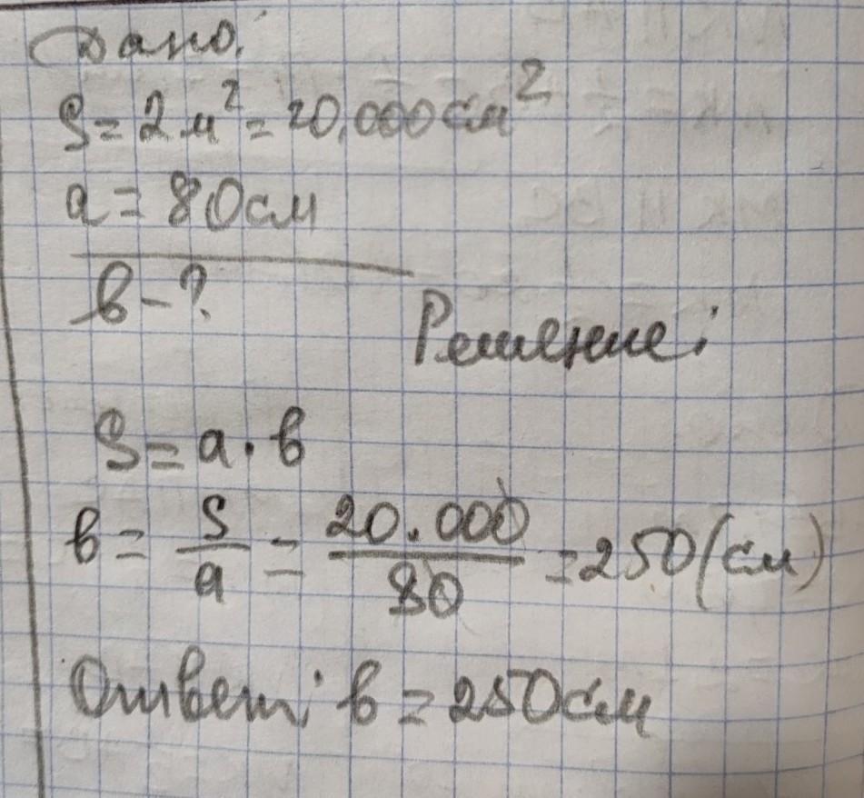 No2. Команда вболівальників виготовила банер на футбольний матч для підтримки гравців. Банер має форму прямокутника, площа якого дорівнює 2 м². Знайдіть довжину банера, якщо його ширина 80см