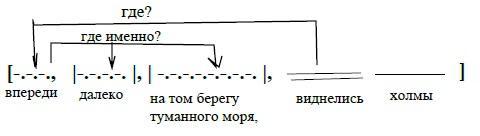 10. Впереди, (где именно?) далеко, (где именно?) на том берегу туманного моря, виднелись(=) выступающие лесистые холмы.
