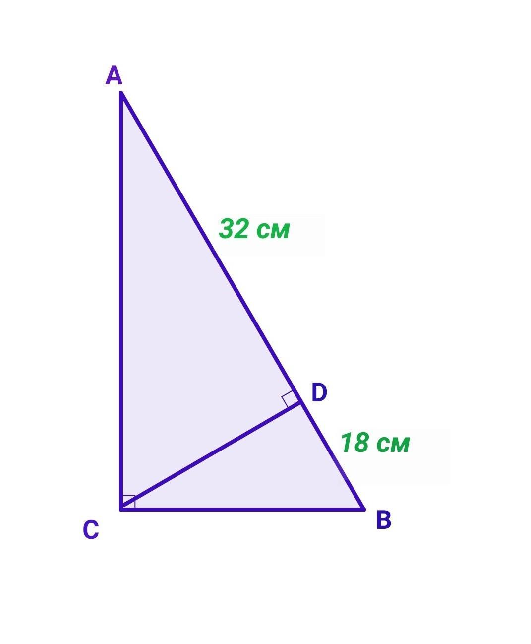 Нехай дано △АВС - прямокутний, ∠С=90°. CD⟂AB. AD=32 см, BD=18 см.