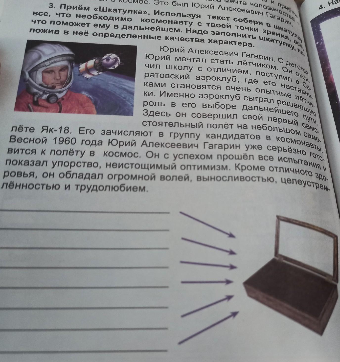 прием «шкатулка».Используя текст собери в шкатулку все, что необходимо космонавту с твоей и точки зрения, все, что поможет ему в дальнейшем. Надо заполнить шкатулку,положив в неё определенные качества характера