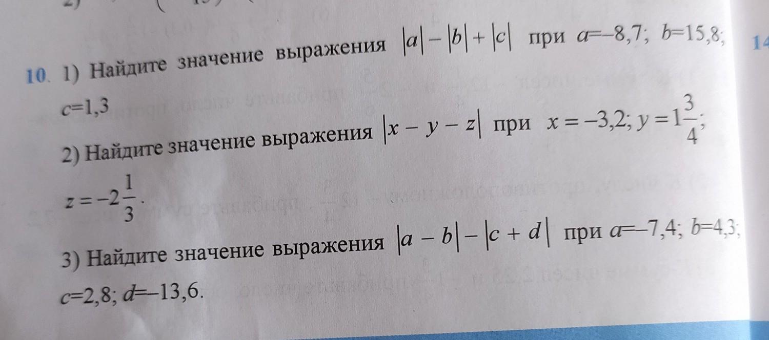 10. 1) Найдите значение выражения |a|-|b|+ |c| при =8,7; b=15,8; c=1,3 y 2) Найдите значение выражения /х - у - z при x=-3,2; у=13; 4' 1 3 3) Найдите значение выражения |a - b| - |c + d| при a=-7,4; b=4,3; c=2,8; d=13,6.