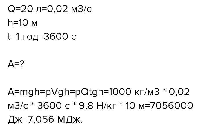СРОЧНО ПОМОГИТЕ!!! Щосекунди насос подає 20 л води на висоту10 м. Яку роботу виконує насос за 1 год? (1л = 1дм3 дециметр кубічний )