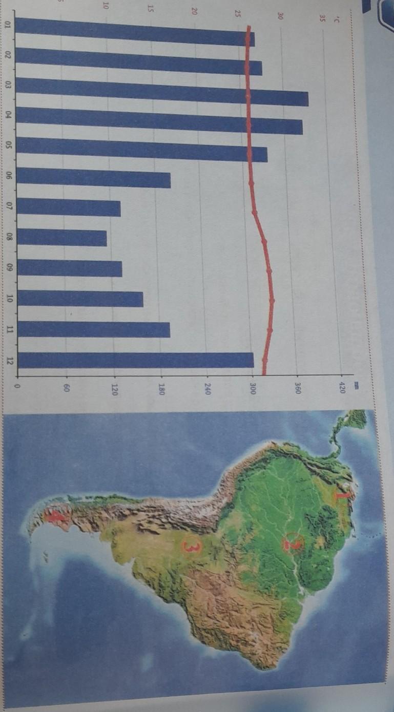 4. На приведённой ниже климатической диаграмме месяцы (1, 2, 3, 4...) показаны цифрами, средние месячные температуры - красной линией, а распределение осадков по месяцам- синими полосами. Пользуясь диаграммой, ответьте на следующие вопросы: • к какому региону из обозначенных номерами на карте соответствует климатическая диаграмма? • для какого климатического пояса характерны данные диаграммы? • укажите причины, по которым разница между среднемесячными температурами мало изменяется в течение года; • на основании месячного количества осадков рассчитайте годовое количество осадков.