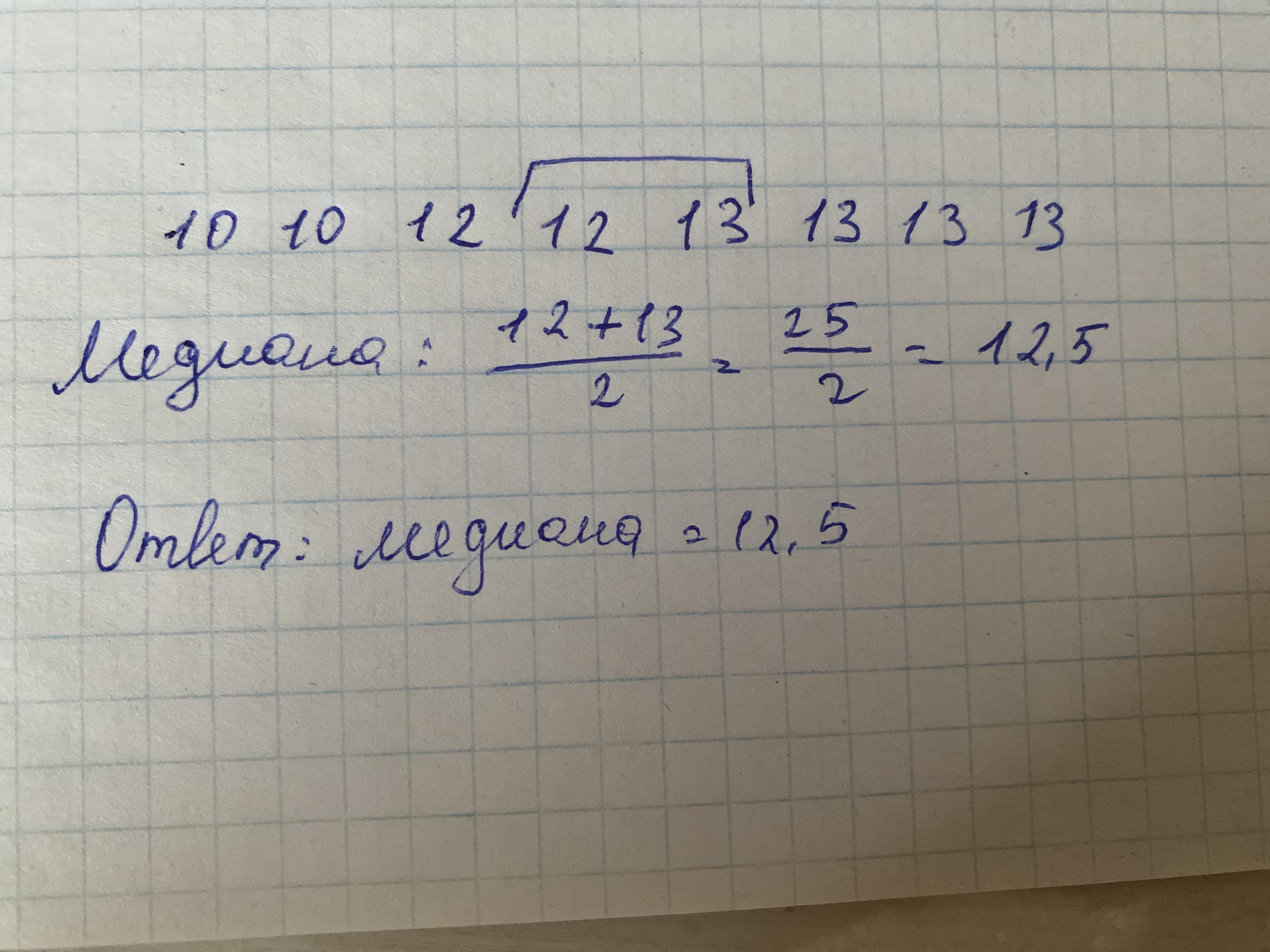 1.На шахматном турнире ученики 6-го класса получили 13, 13, 12, 13, 10, 13, 12, 10 очков .Найдите медиану!