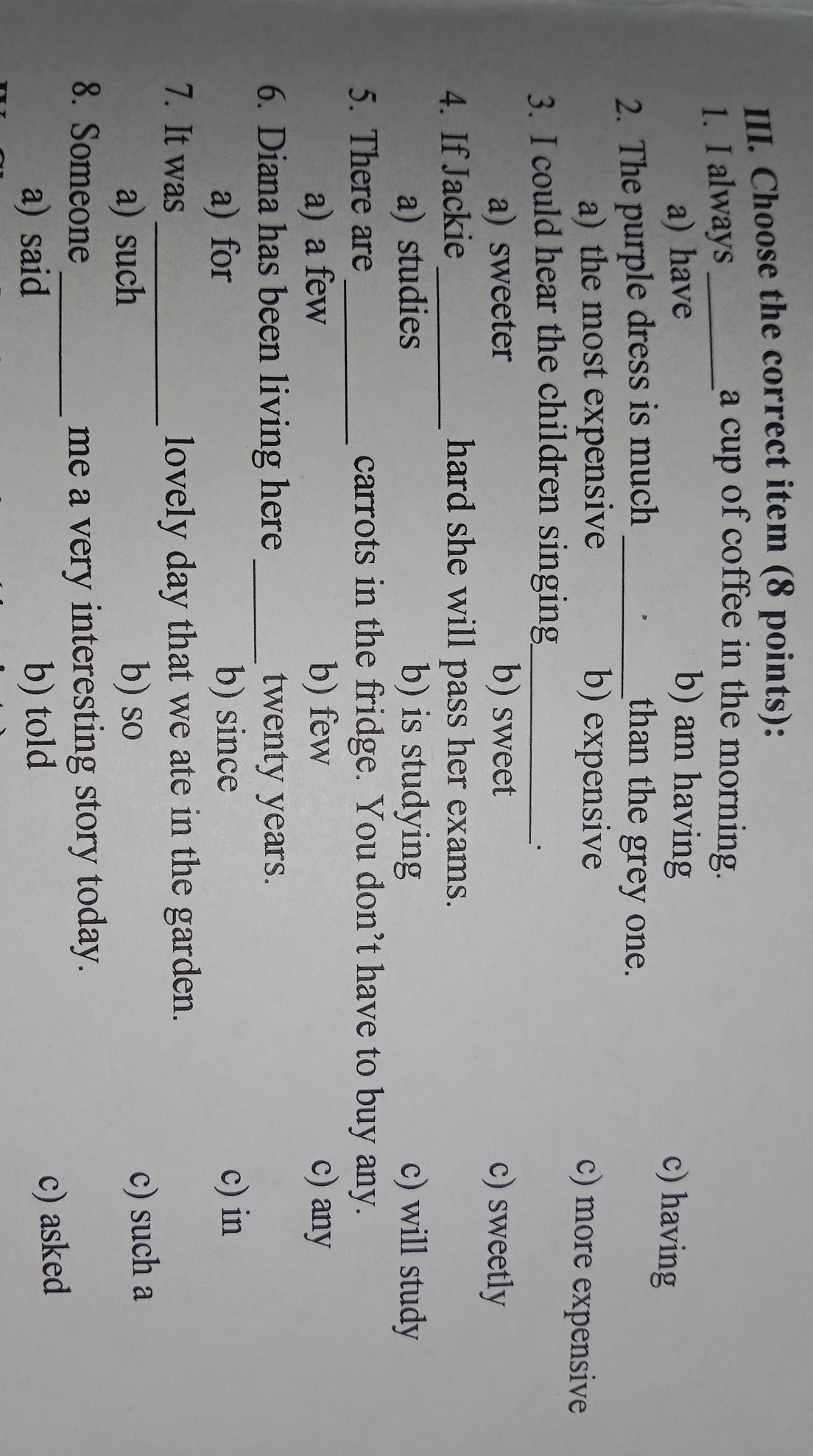 Відповідь: 1) A 2) C 3) C 4) A 5) B 6) A 7)C 8) B