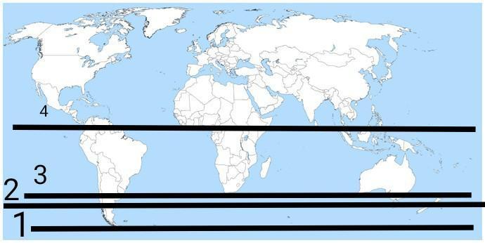 Антарктида- самый южный материк нашей планеты. Ближайший к ней материк - Южная Америка, на карте её южная граница обозначена линией 1. Далее следует Австралия- её линия 2, как и Южная Америка, по большей части находятся в южном полушарии. Африка - её линия - 3, Евразия является самым дальним из выбранных материком от Антарктиды. Граничит с полярным кругом! Её линия обозначена цифрой 4.