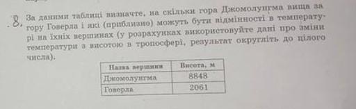 Відповідь: Джомолунгма вище за Говерлу на 6787 м. Різниця температур складає приблизно 41°С (холодніше на Джомолунгмі!).