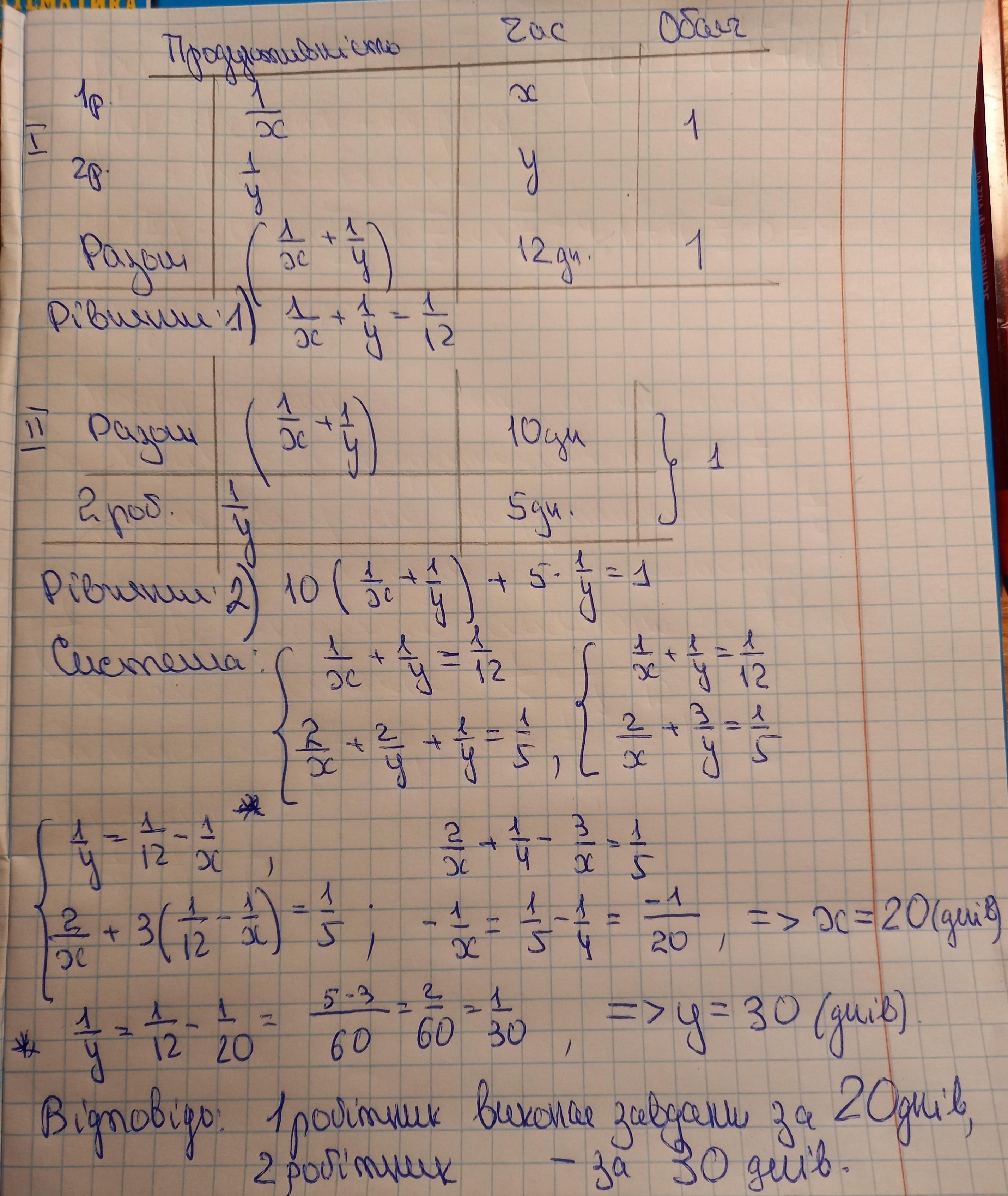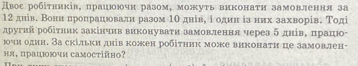 Двоє робітників, працюючи разом, можуть виконати замовлення за 12 днів. Вони пропрацювали разом 10 днів, і один із них захворів. Тоді другий робітник закінчив виконувати замовлення через 5 днів, працю-ючи один. За скільки днів кожен робітник може виконати це замовлен-ня, працюючи самостійно?