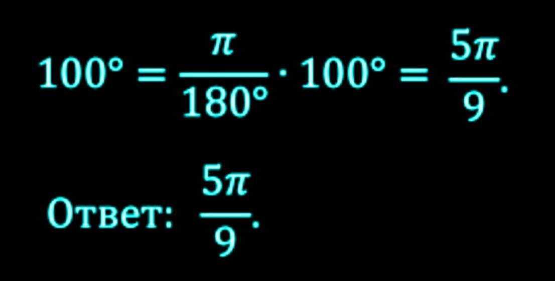 100 градусов * (π/180) = (5/9)*π радиан (введем коэффициент перевода π/180 - это число радиан в одном градусе, и умножим на 100 градусов)