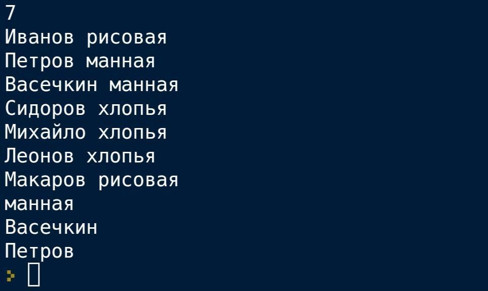 В детском саду расширили ассортимент завтраков. Теперь на завтрак малыши могут выбрать рисовую, овсяную и манную каши, хлопья, омлет. У воспитателя записаны фамилии ребят и список их любимых блюд на завтрак. Нужно помочь воспитателю составить список детей, которые любят определенный завтрак.
