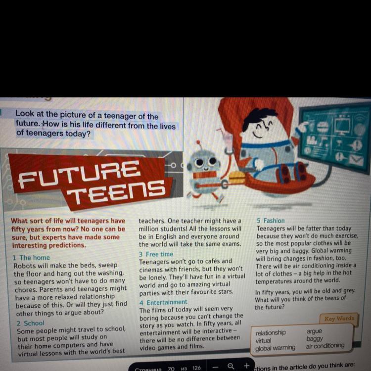 The life of a teenager of the future is really good. The robots make the life like a dream. You don’t have to do a chores and they will not have any problems to argue about.Not like now. Imagine you can just stay at home and have a virtual lesson with the best teachers in world! You would like to stay at home and be with your friends in virtual world! What a great life! You can watch a film and change the story but for now it is boring. You would not see any difference between video games and films. But the teenagers will be fatter because the robots do everything for them so they don’t do much exercise, but there is a solution for clothing that can survive a global warming.