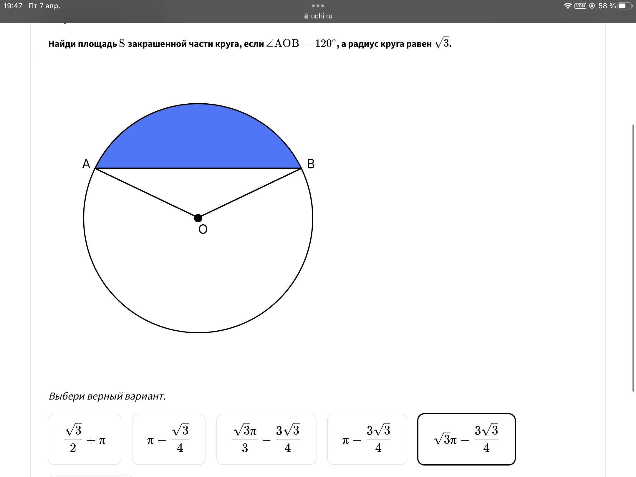 Найти площадь закрашенной части круга если угол AOB=120 а радиус =корень из 3