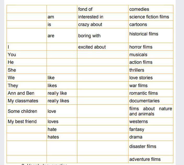 I You He She We 1. Make up sentences. (Прочитати, перекласти жанри фільмів. Утворити і записати 10 речень)