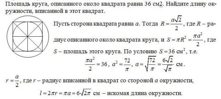 Квадрат площадью 36 см2 обведен вокруг линии круга. Найти длину линии!