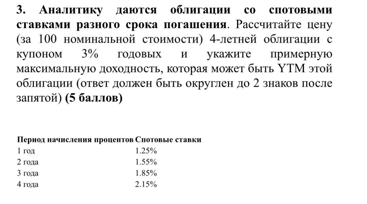 (за 100 номинальной стоимости) 4-летней облигации с купоном 3% годовых и укажите примерную