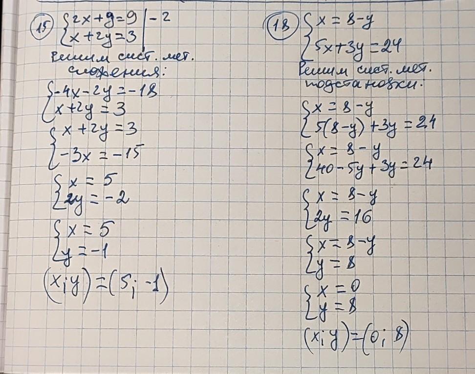 15) [2x+y=9 x+2y=3!!! 18)[x=8-y) 5x+3y=24!!! 7 класс новая книга 2022 пожалуйста делайте правильно!!!