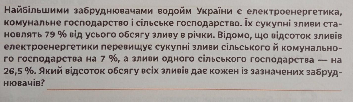 Найбільшими забруднювачами водойм України є електроенергетика, комунальне господарство і сільське господарство. Їх сукупні зливи ста- новлять 79% від усього обсягу зливу в річки. Відомо, що відсоток зливів електроенергетики перевищує сукупні зливи сільського й комунально- го господарства на 7%, а зливи одного сільського господарства на 26,5%. Який відсоток обсягу всіх зливів дає кожен із зазначених забруд- нювачів?