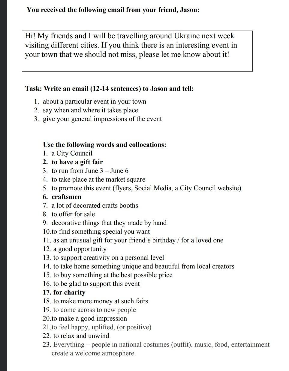 Thank you for letting me know about your trip to Ukraine. I'm excited to hear that you'll be visiting different cities! If you're coming to my town, I would highly recommend checking out the gift fair that will be taking place at the market square.