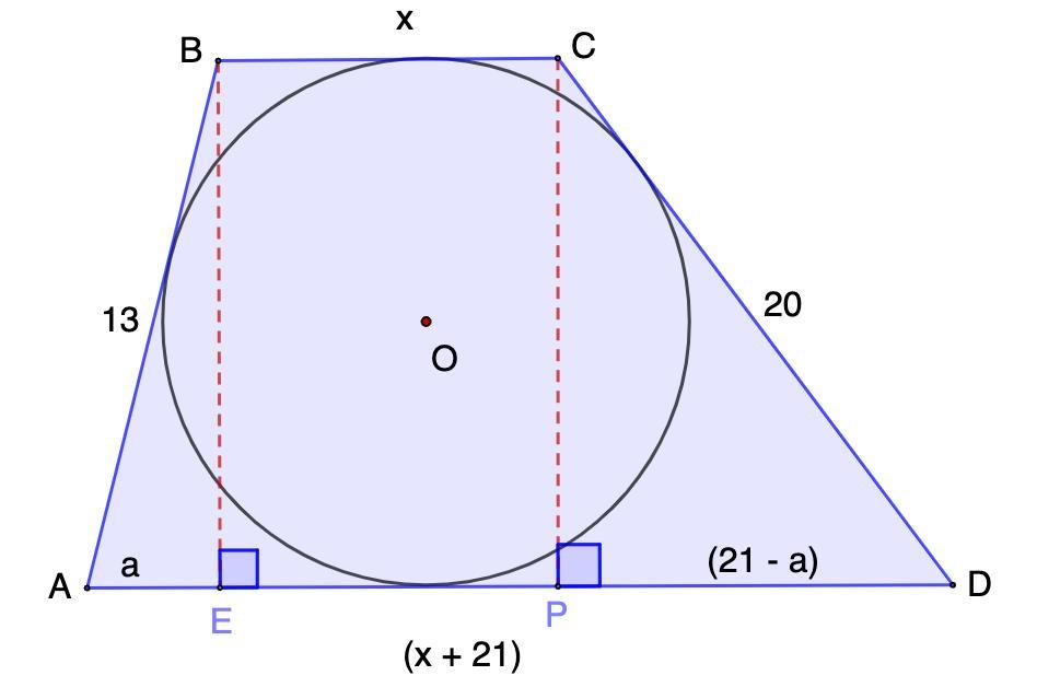 В четырехугольнике ABCD, описанном около окружности, АВ=13, CD=20, стороны AD и BC параллельны и AD-BC=21. Найдите площадь этого четырехугольника.