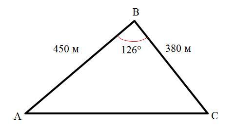Решение. Известно: AB = 450 м, ВС = 380 м, ∠B = 126° (см. рисунок).