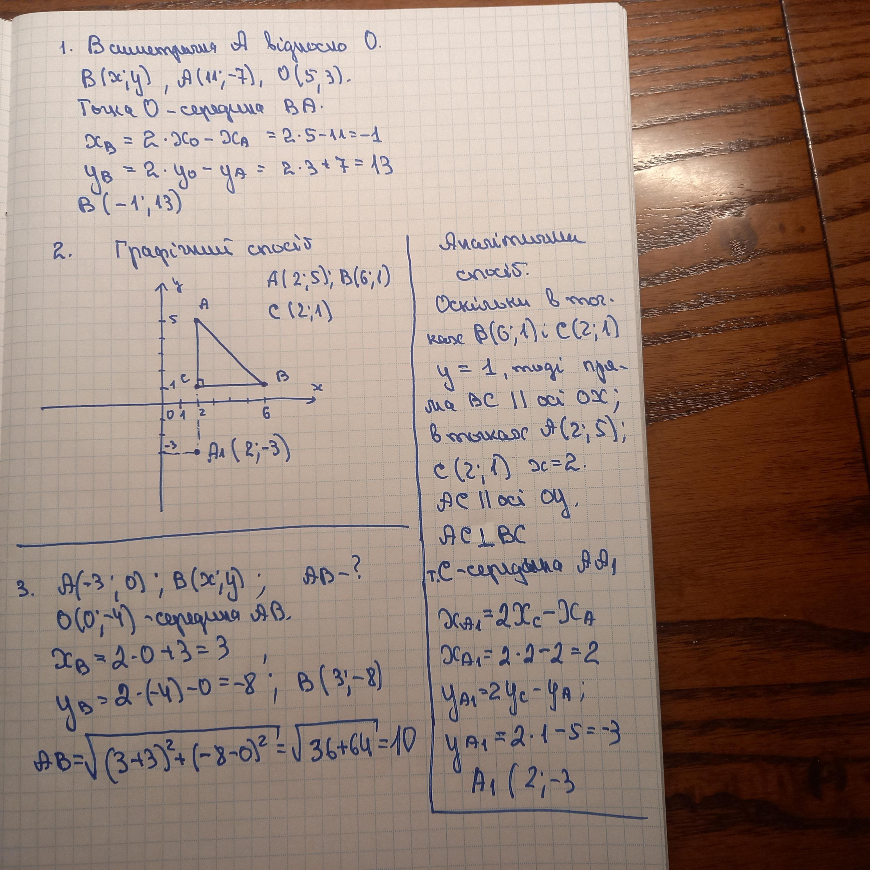 1. Точка В симетрична точці А відносно точки О. Знайдіть координати точки В, якщо А(11;-7), О(5;3). У відповідь записати координати точки в дужках через крапку з комою без пробілів. Наприклад, (1;2)