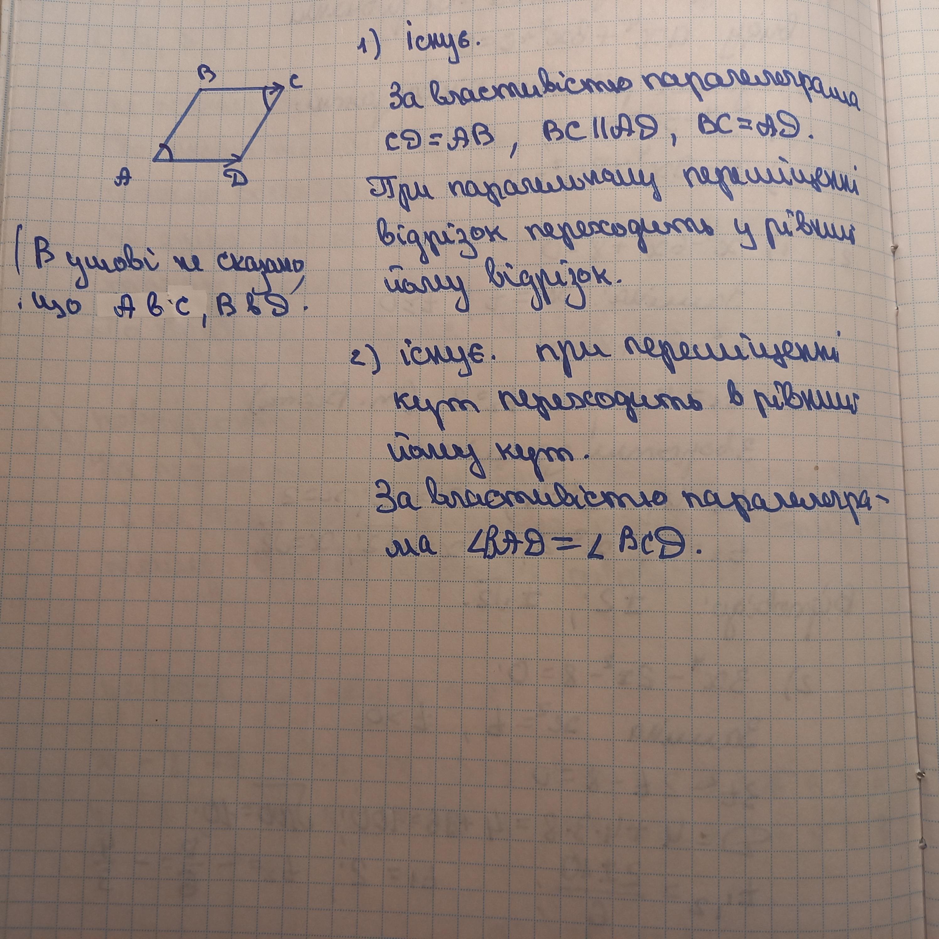 ПОЖАЙЛУСТА СРОЧНО!!!!!! ABCD - паралелограм. Чи існує переміщення, при якому: 1) сторона АВ переходить у сторону CD;