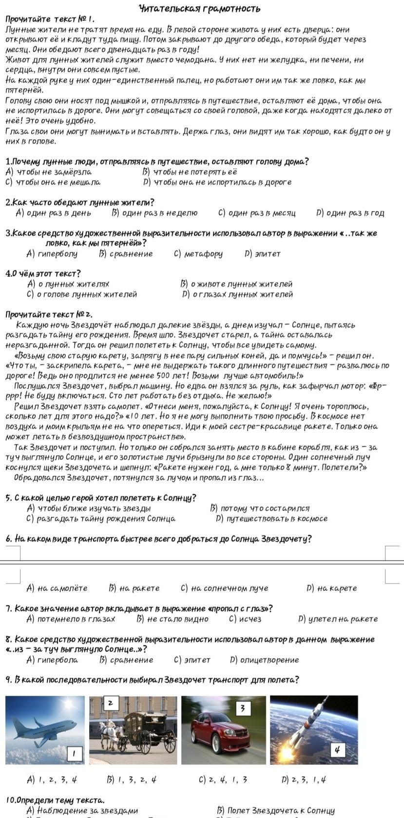 Прочитайте текст № 1. Лунные жители не тратят время на еду. В левой стороне живота у них есть дверца: они открывают её и кладут туда пищу. Потом закрывают до другого обеда, который будет через месяц. Они обе дают всего двенадцать раз в году! Живот для лунных жителей служит вместо чемодана. У них нет ни желудка, ни печени, ни сердца, внутри они совсем пустые. На каждой руке у них один-единственный палец, но работают они им так же ловко, как мы пятерней. Голову свою они носят под мышкой и, отправляясь в путешествие, оставляют её дома, чтобы она не испортилась в дороге. Они могут совещаться со своей головой, даже когда находятся далеко от неë! Это очень удобно. Гла за свои они могут вынимать и вставлять. Держа глаз, они видят им так хорошо, как будто он у них в голове. 1. Почему лунные люди, отправляясь в путешествие, оставляют голову дома? А) чтобы не замерзла 13) чтобы не потерять её c) чтобы она не мешала D) чтобы она не испортилась в дороге