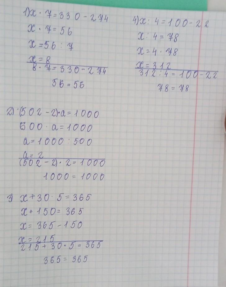8. Реши уравнения. 1) x · 7 = 330 – 274 )2)(502-2) a = 1000 3)x + 30 · 5 = 365 4)x:4=100-22 пж с проверкой!