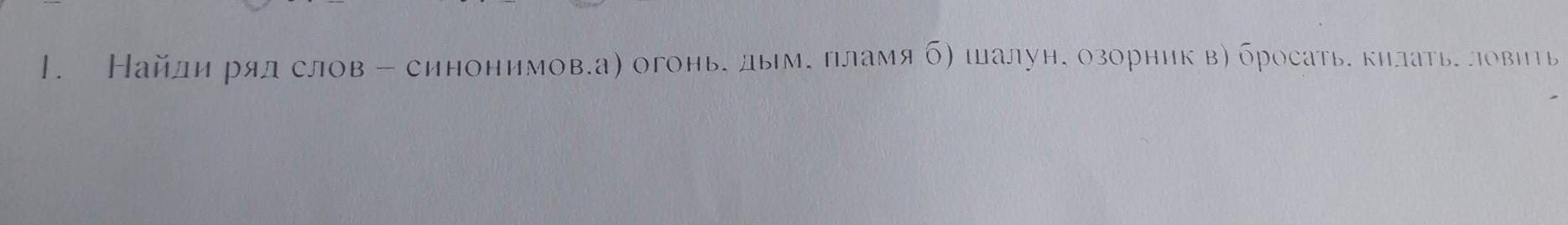 1. Найди ряд слов - синонимов А) огонь, дым, пламя б) шалун, озорник в) бросать, кидать ловить