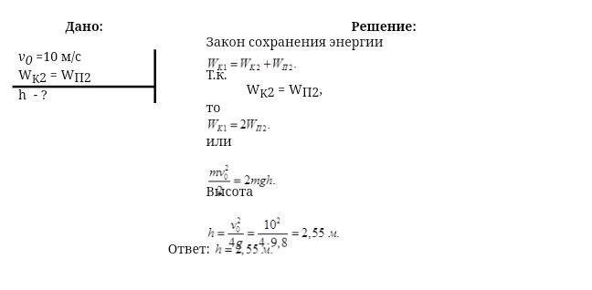 Камень брошен вертикально вверх со скоростью 10 м/с. На какой высоте кинетическая энергия камня составляет 1/2 часть энергии.