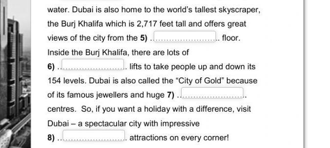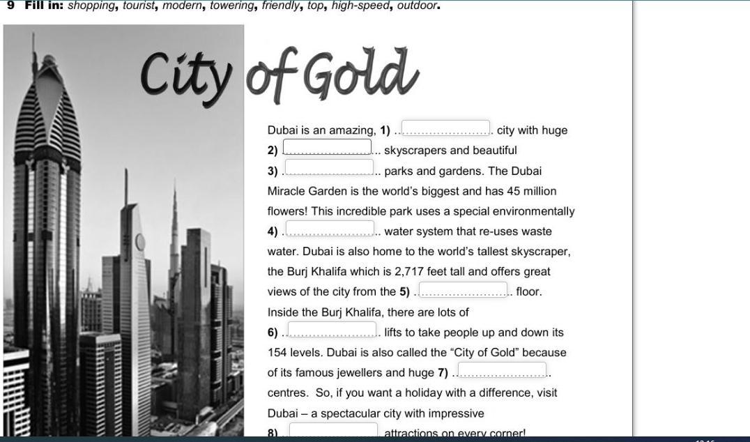 1 . tourist 2. towering 3. modern 4. friendly 5. top 6. high-speed 7. shopping 8. outdoor;