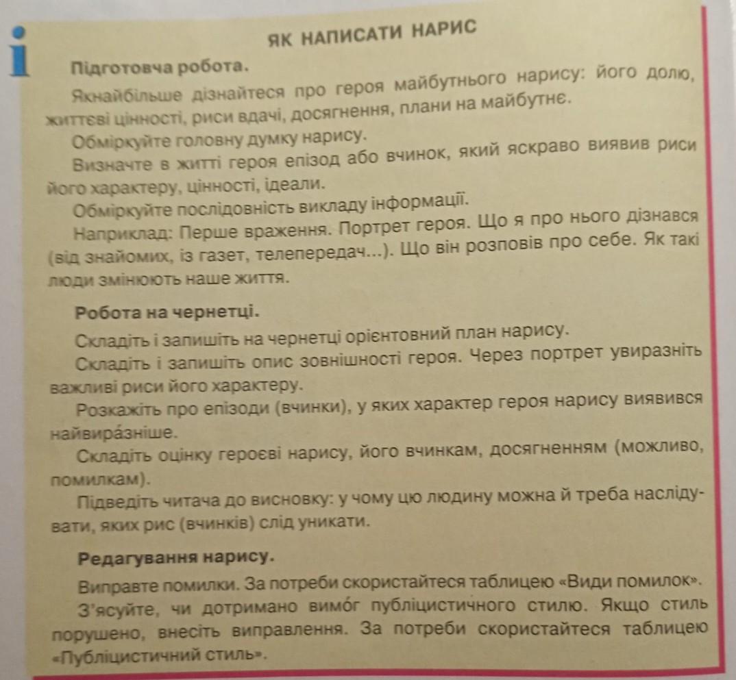 Оберіть героя майбутнього нарису. Із різних джерел зберіть про нього якнайбільше інформації. Напишіть портретний нарис у публіцистичному стилі.