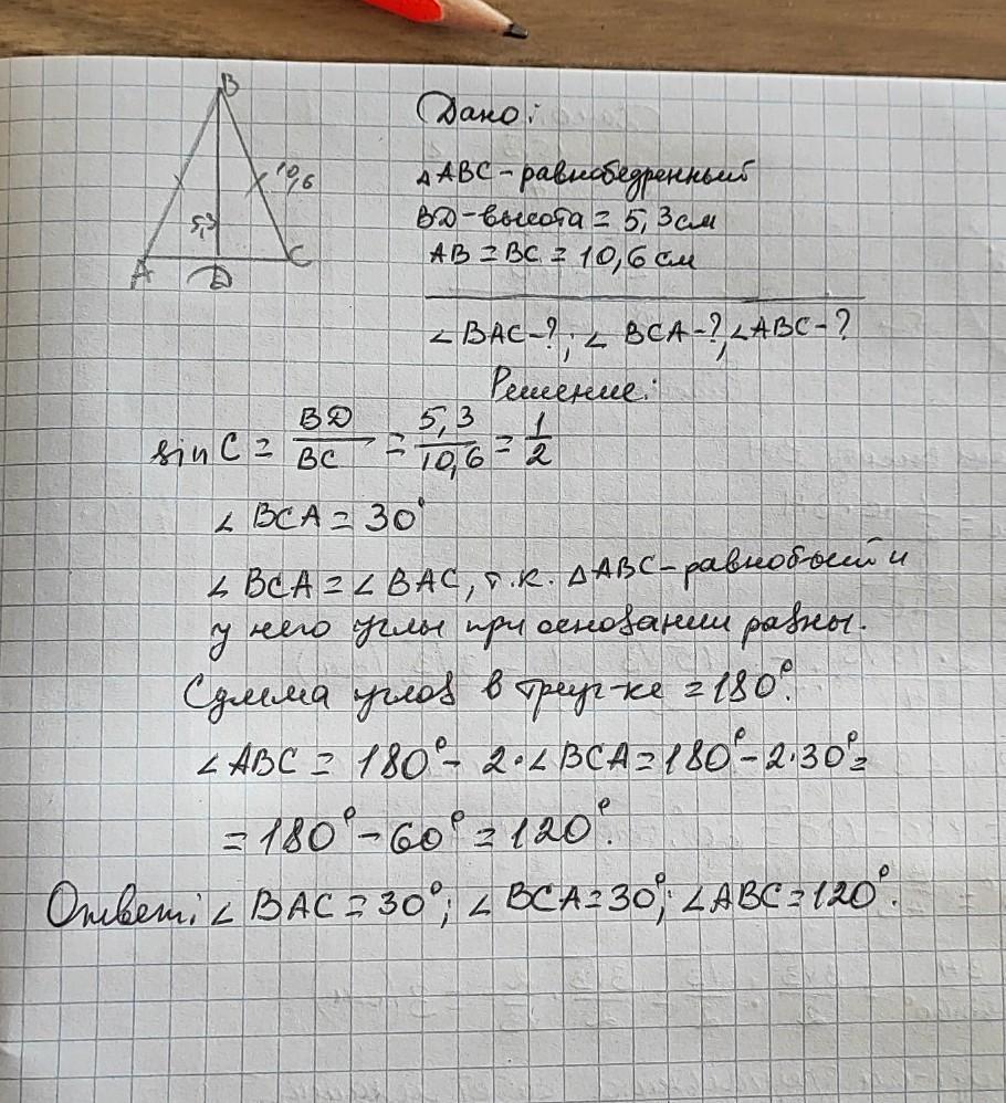 У рівнобедреному трикутнику ABC проведена висота BD до основи AC. Довжина висоти — 5,3 см. Довжина бічної сторони — 10,6 см.