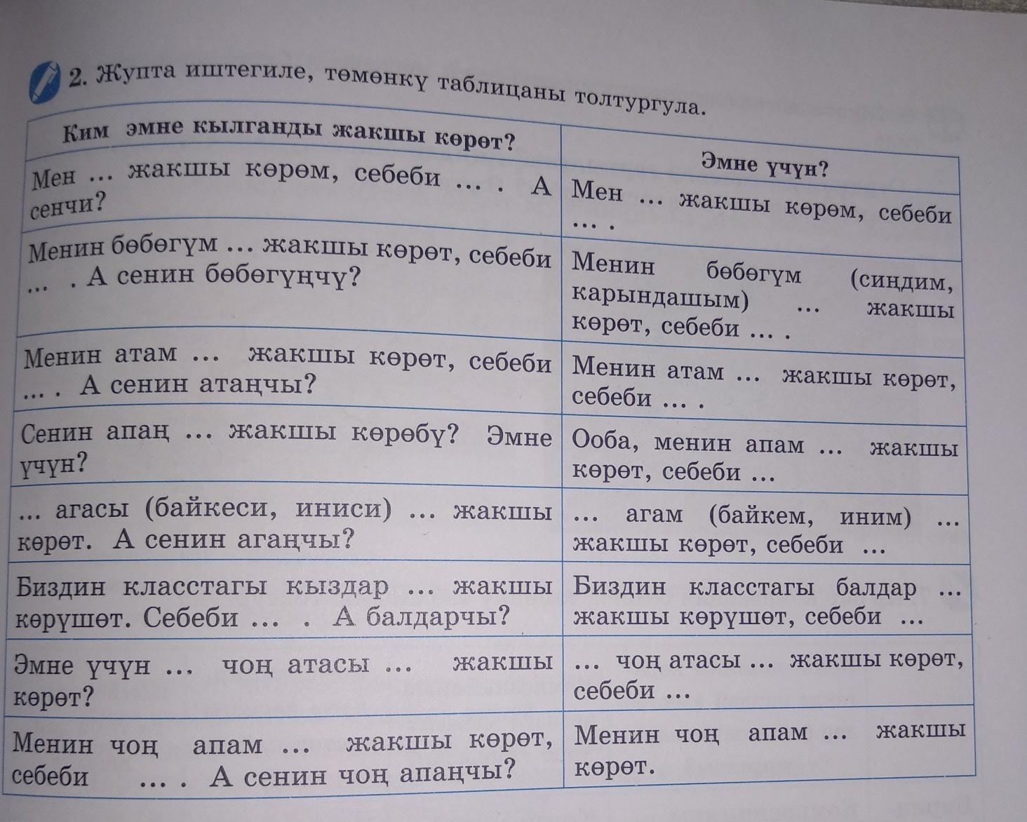 2. Жупта иштегиле, теменку таблицаны толтургула. Ким эмне кылганды жакшы көрөт? Мен ... жакшы көрем, себеби сенчи? Менин бөбөгүм ... жакшы көрөт, себеби Менин А сенин бөбөгүнчү? *** Эмне үчүн? . А Мен ... жакшы көрем, себеби карындашым) көрет, себеби Менин атам ... жакшы керет, себеби Менин атам ... А сенин атанчы? себеби Сенин апан ... жакшы көрөбү? Эмне Ооба, менин апам учун? керет, себеби ... агам (байкем, иним) жакшы көрөт, себеби Биздин класстагы балдар жакшы көрүшет, себеби агасы (байкеси, иниси) ... жакшы керет. А сенин аганчы? Биздин класстагы кыздар жакшы керүшет. Себеби ... .. . А балдарчы? чон атасы Эмне үчүн керет? Менин чон апам себеби .... жакшы жакшы көрөт, *** А сенин чоң апанчы? бебегум (синдим, жакшы *** жакшы көрөт, ... Менин чоң апам көрөт. жакшы *** *** *** ... чон атасы ... жакшы керет. себеби ... жакшы
