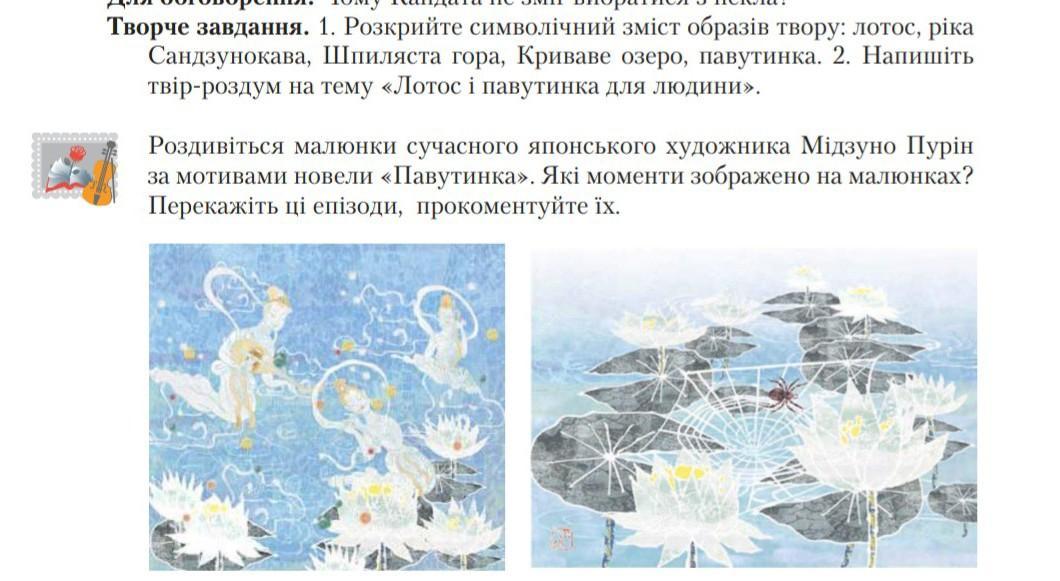 Рассмотрите картинки современного японского художника Мидзуно Пурин по мотивам новеллы «Паутинка». Какие моменты изображены на рисунках? Перескажите эти эпизоды, прокомментируйте их.