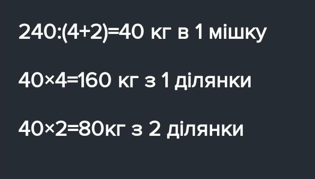 З першої грядки зібрали 4 однакових мішки моркви, а з другої 2. Маса всієї зібраної моркви становить 240кг. Яка маса одного мішка? Будь ласка розв'яжіть