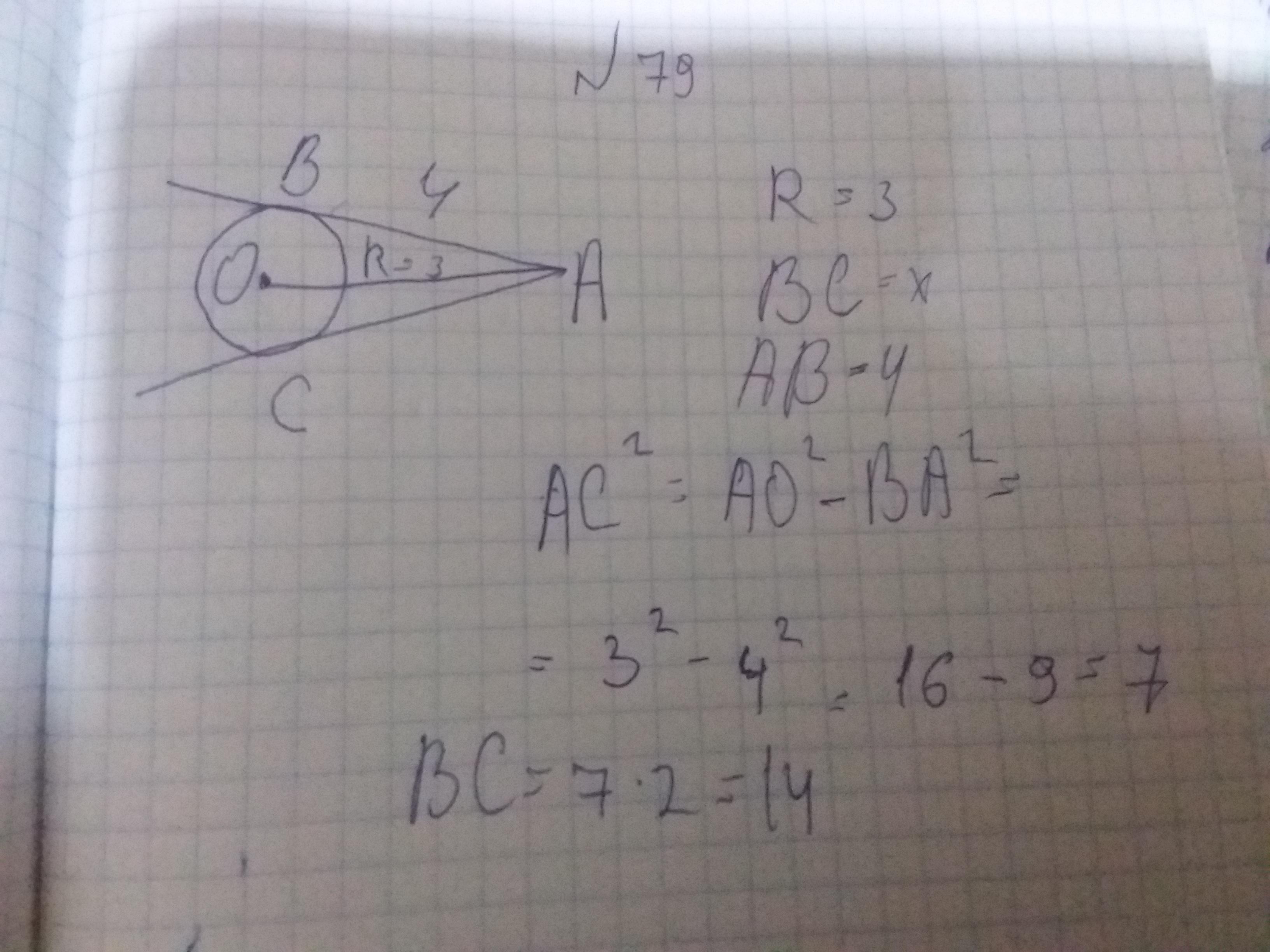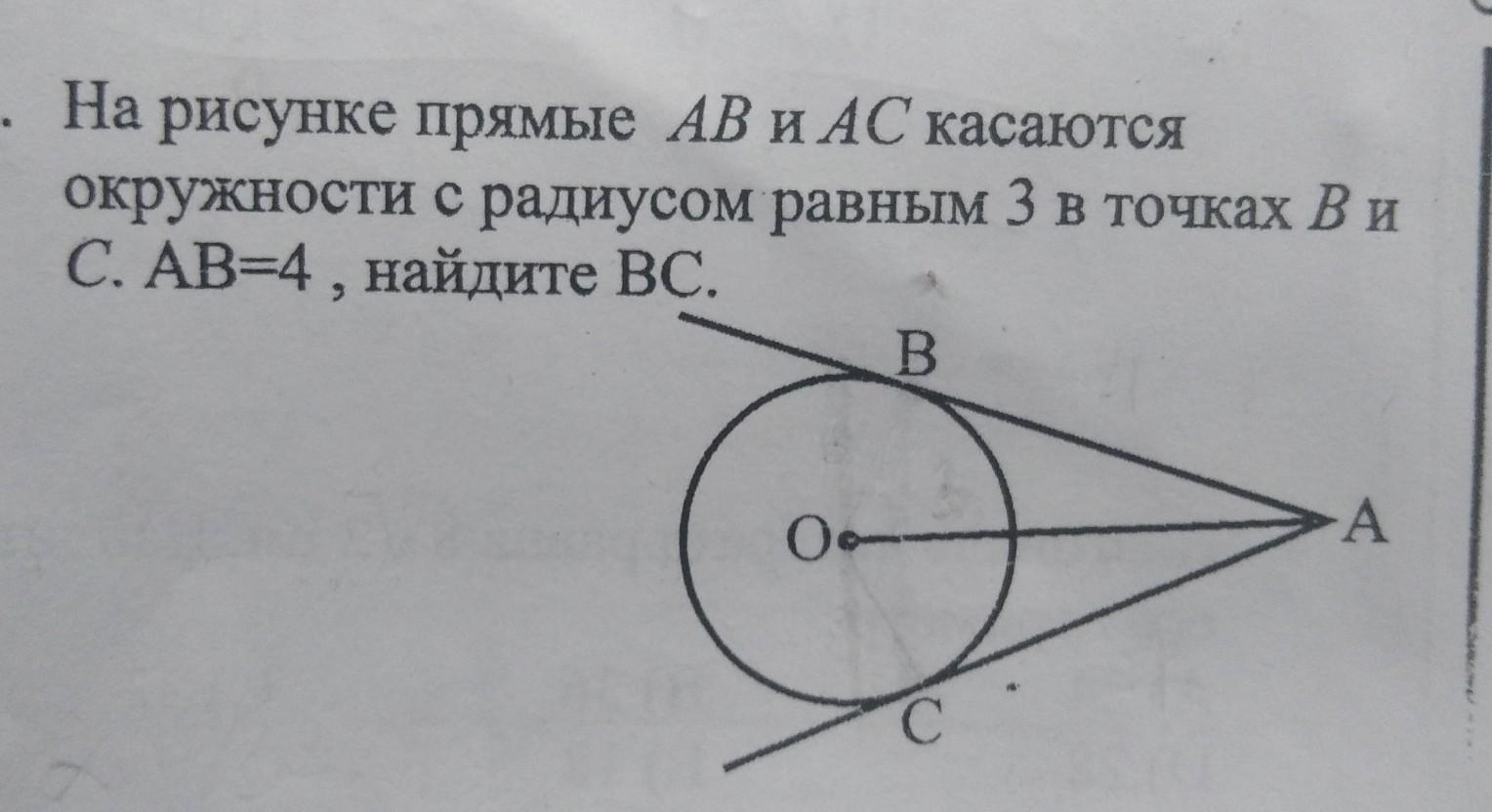 на рисунке прямые АВ и АС касаются окружности с радиусом равным 3 в точках В и С. АВ=4, найдите ВС