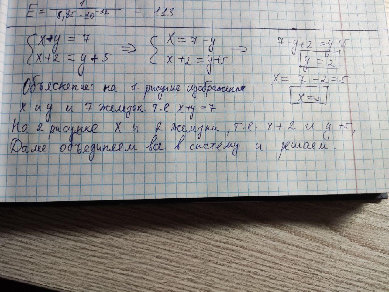 Составьте систему уравнений, воспользовавшись двумя весами, и найдите неизвестные.