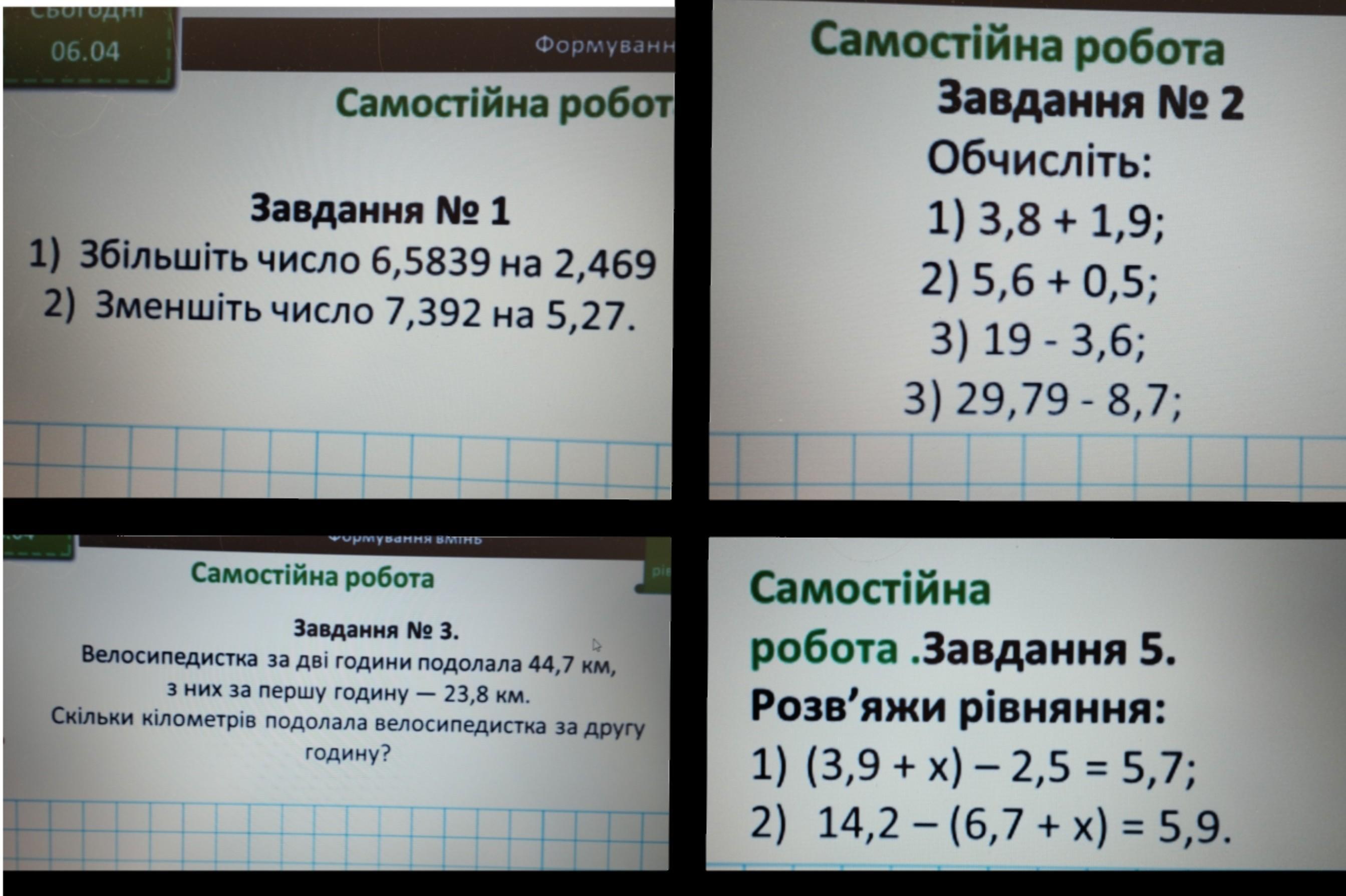 06.04 Формуванн Самостійна робот Завдання № 1 1) збiльшiть число 6,5839 на 2,469 2) Зменшіть число 7,392 на 5,27. ормування ВМ НЬ Самостійна робота Завдання № 3. Велосипедистка за дві години подолала 44,7 км, з них за першу годину 23,8 км. Скільки кілометрів подолала велосипедистка за другу годину? - pie Самостійна робота Завдання № 2 Обчисліть: 1) 3,8 + 1,9; 2) 5,6 + 0,5; 3) 19 - 3,6; 3) 29,79 - 8,7; Самостійна робота .Завдання 5. Розв'яжи рівняння: 1) (3,9 + x) − 2,5 = 5,7; 2) 14,2 − (6,7 + x) = 5,9. -