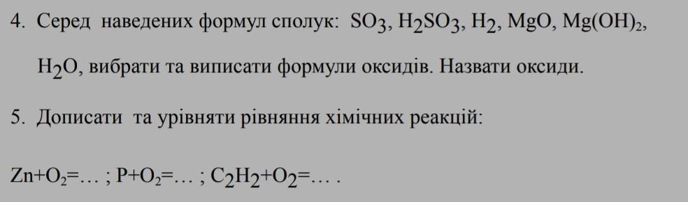 5. Дописати та урівняти рівняння хімічних реакцій: Zn+O2=... ; P+O2=... ; C2H2+O2=...